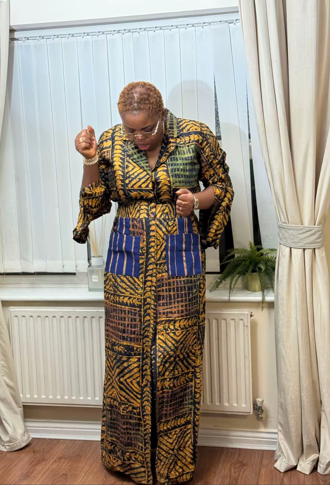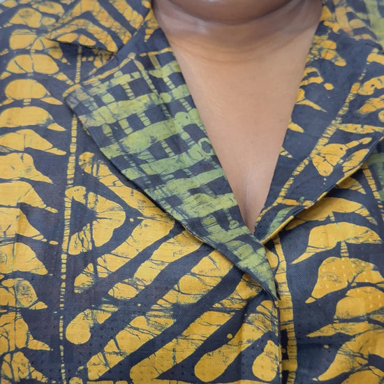 A statement in rhythm and restraint, the drip blazer dress is crafted from cotton brocade Adire fabric. The structured silhouette features a crisp collar. Graphic yet sophisticated, it translates raw mark making into wearable art.